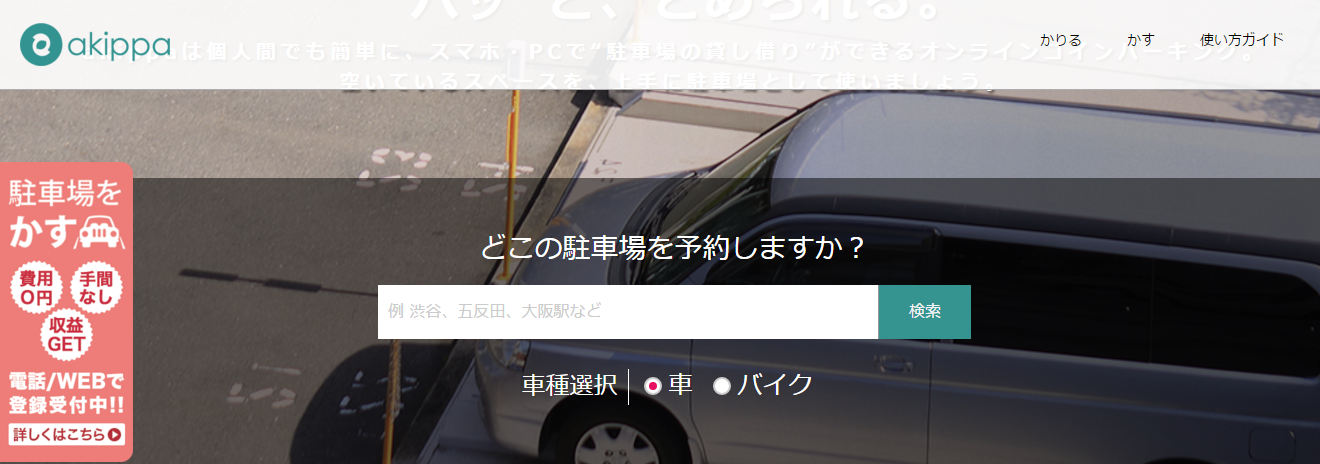空いている月極駐車場や、マンション・アパートの駐車場を、利用したいユーザーに提供する、シェア型のパーキングサービスです。