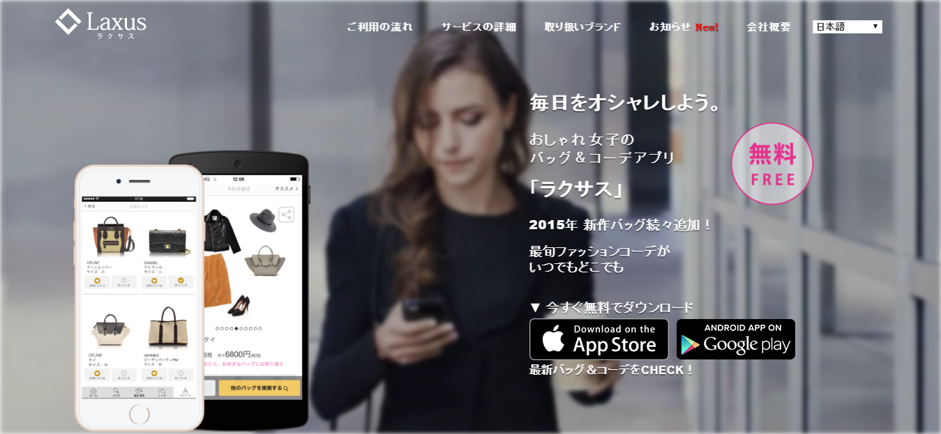 | Laxus | ブランドバッグのシェアリングサービス。 月額6,800円で、最新のブランドバックを、無期限・個数無制限で利用できる。 |