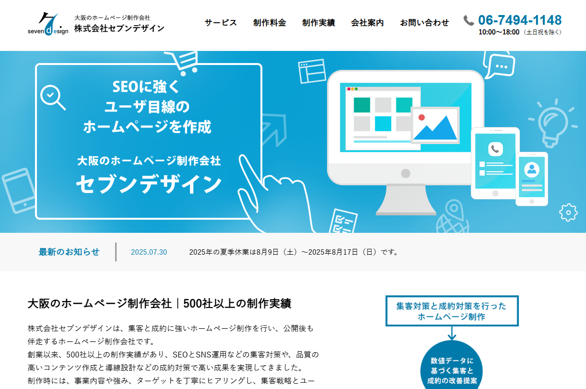 大阪のホームページ制作会社株式会社セブンデザインは、創業以来500社以上の制作実績を持つ、集客と成約に強いホームページ制作会社です。