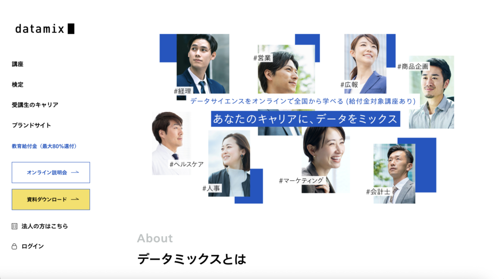 datamixは、ビジネスパーソン向けのデータサイエンススクールです。データ分析や統計、機械学習などを体系的に学べるカリキュラムを提供しており、企業でのデータ活用を目的とした教育プログラムが特徴です。