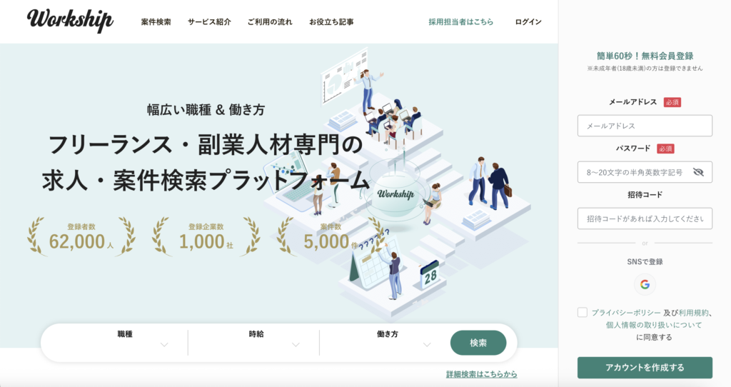 Workshipは、フリーランス向けに業務委託案件を紹介するプラットフォームで、クリエイティブ系からマーケティング、エンジニア系まで幅広いジャンルの案件を扱っています。特にスタートアップや成長企業の中・長期案件が多い点が特徴です。