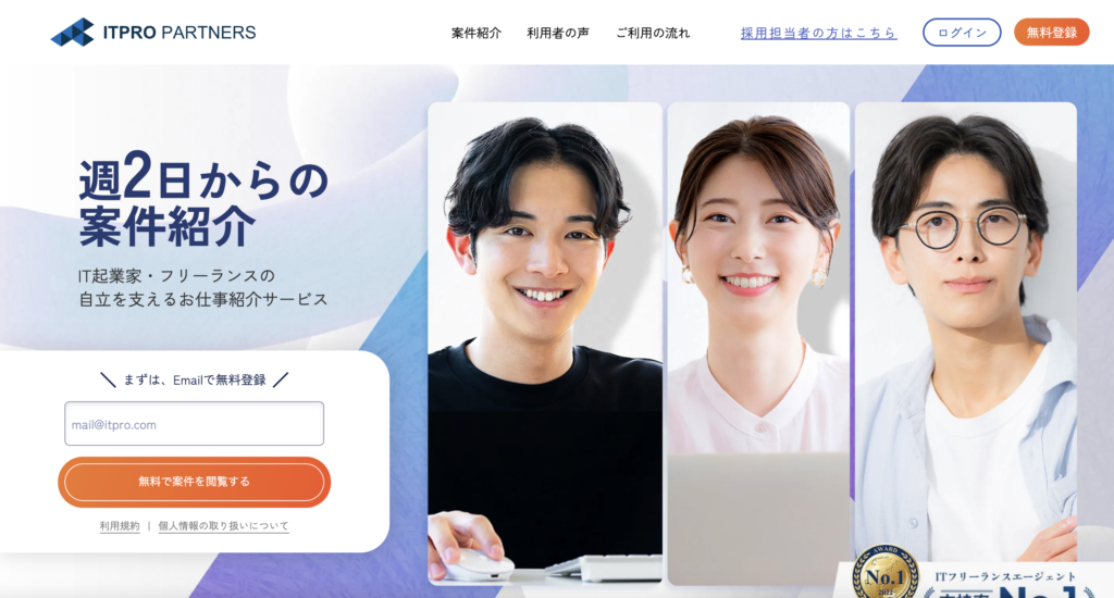 ITプロパートナーズは、ITエンジニアやデザイナー、マーケター向けのフリーランス・業務委託案件を専門に扱うエージェント型プラットフォームです。週3日〜週5日稼働のリモート案件を多数掲載し、専門性の高い求人が特徴です。