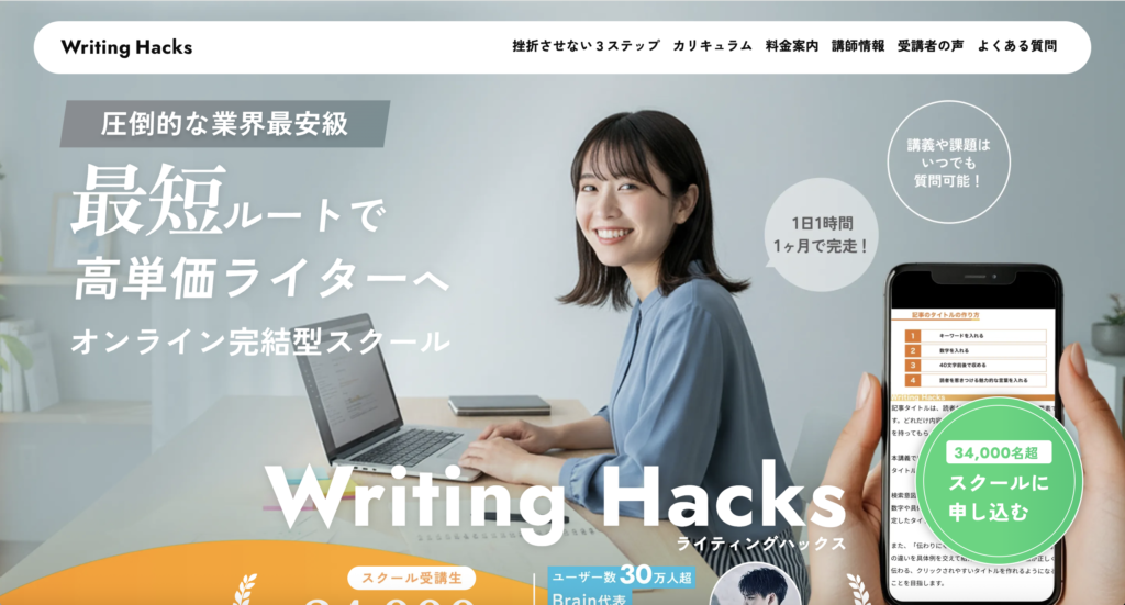 Writing Hacksは、未経験からWebライターを目指す人向けのオンライン講座です。SEO記事の書き方や記事構成の作り方など、Webライティングに必要なスキルを動画講座で学ぶことができます。