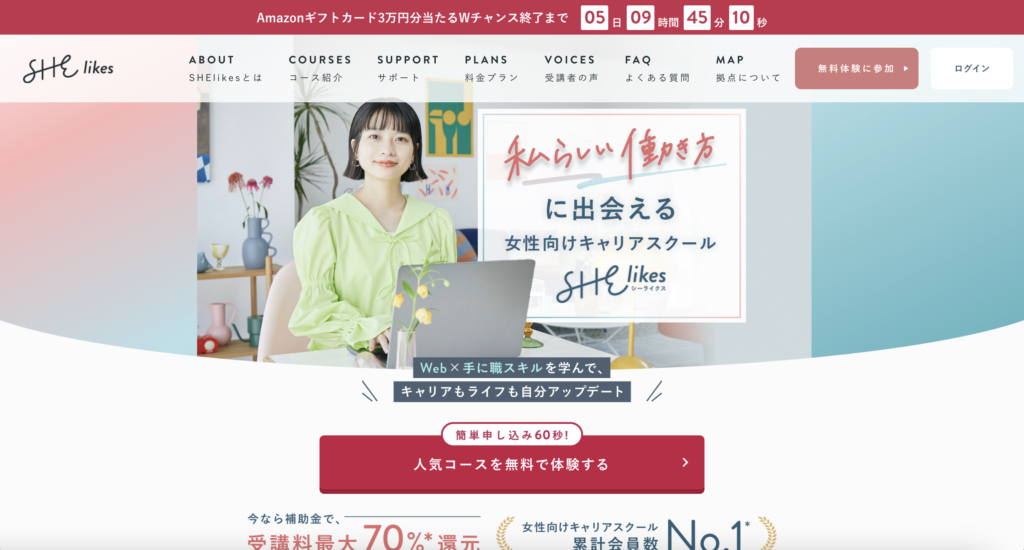 SHElikesは、女性向けのキャリアスクールとしてWebデザインやマーケティング、ライティングなどの講座を提供しているサービスです。Webライティングコースでは、SEO記事の書き方やコピーライティングなどを学ぶことができます。