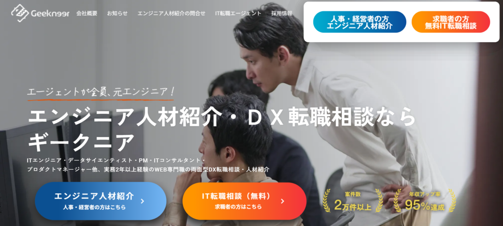 ギークニアは、ITエンジニアを中心とした専門職の転職支援を行う人材紹介会社です。ITエンジニア、データサイエンティスト、ITコンサルタント、プロジェクトマネージャーなど、IT領域の高度人材に特化した求人を取り扱っています。