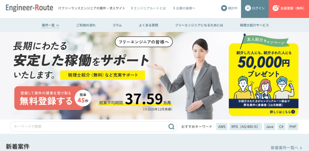 エンジニアルートは、ITフリーランスエンジニア向けの案件紹介・キャリア支援サービスを提供する人材マッチングサービスです。フリーランスとして働くエンジニアに対し、案件紹介だけでなく、カウンセリングから参画後のフォロー、プロジェクト終了までを一貫してサポートしています。
