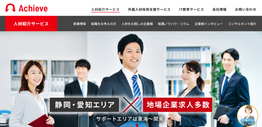 アチーヴキャリアは、静岡・愛知エリアを中心に転職支援を行う人材紹介サービスです。IT系および製造系エンジニア領域に強みを持ち、地域企業と求職者を結びつけるキャリア支援を提供しています。地域密着型のサービスとして、地元企業の求人情報や働き方に関する詳細な情報を提供し、安心して転職活動を進められる体制を整えています。