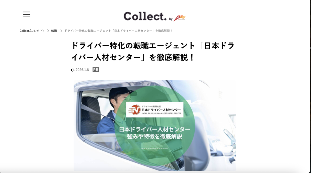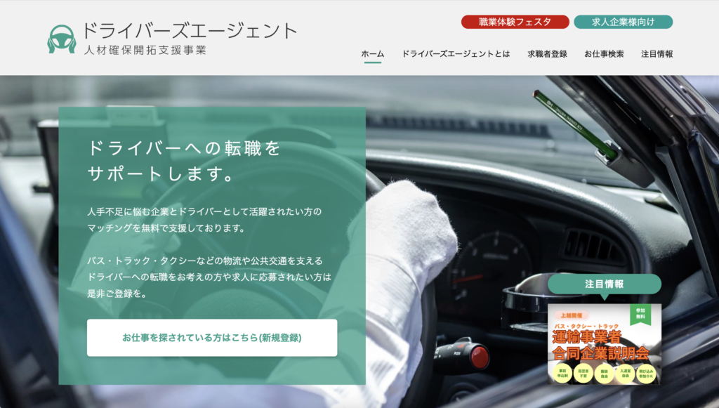 ドライバーズエージェントは、運輸業界全般のドライバー求人を取り扱う転職支援サービスであり、トラックドライバーをはじめ、バス・タクシーなど複数の車種・業態に対応した求人紹介を行っています。