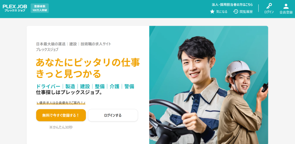 プレックスジョブは、運送・建設・製造などのエッセンシャルワーカー領域に特化した求人・転職支援サービスです。トラックドライバーや施工管理、自動車整備士などの職種を中心に全国規模で求人情報を掲載しており、業界最大級の求人数を取り扱っています。