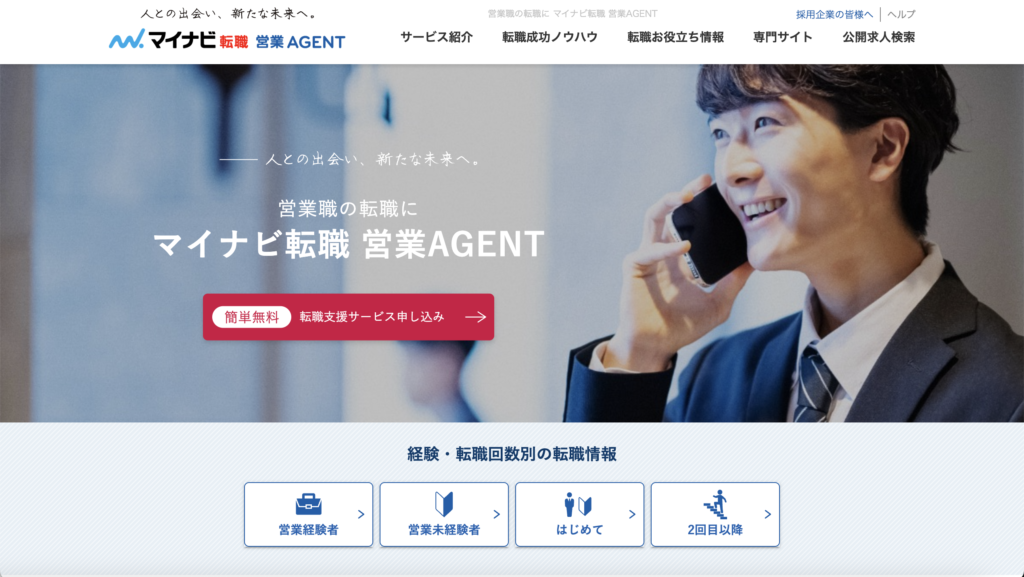 マイナビ営業エージェントは、大手人材会社マイナビが提供する営業職に特化した転職支援サービスです。若手や第二新卒層の営業転職支援で特に実績が高く、未経験者から経験者まで幅広い層に対応しています。