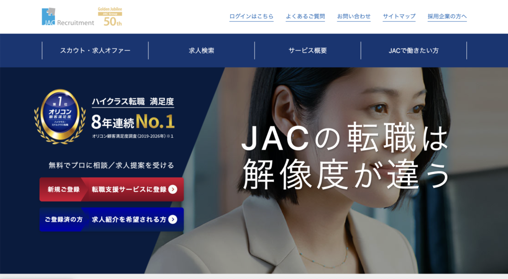 JACリクルートメントは、国内外のハイクラス人材転職支援に強みを持つ大手転職エージェントです。管理職・外資系企業・高年収ポジションの営業職紹介に定評があります。