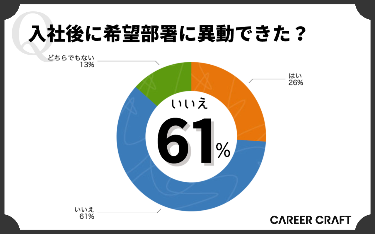 アンケートの結果、初期配属で希望が通らなかった人の61%の人が入社後も希望部署に異動できなかったことが分かりました。