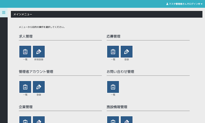 求人募集や応募情報の登録から管理まで、すぐに使える便利な管理画面をご用意。求人情報はCSVによる一括アップロード・ダウンロード、応募情報はCSVダウンロードに対応しています。