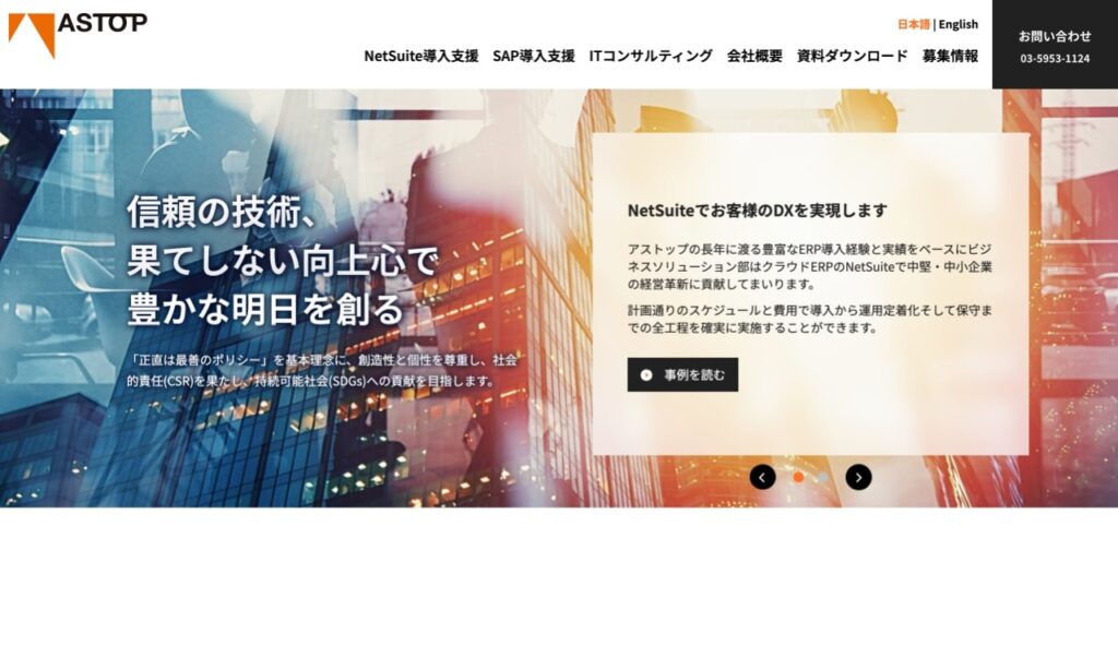 事業の中核にあるのが、クラウドERP「NetSuite」を軸とした導入支援です。アストップはNetSuiteの導入を通じて企業のパフォーマンスを引き上げ、イノベーションの実現を後押しする立場を取り、まず業務課題の分析と業務設計から入り、予算・スケジュールを守りながら導入を進めることを明確にしています。