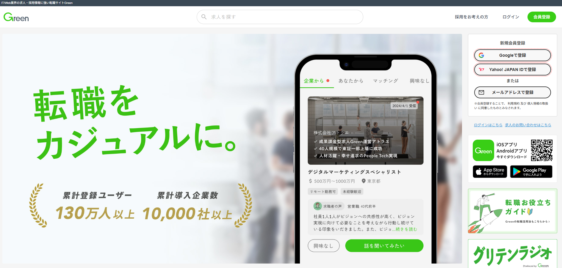 Greenは求人票と企業紹介が同一ページで整理され、応募導線が明快。