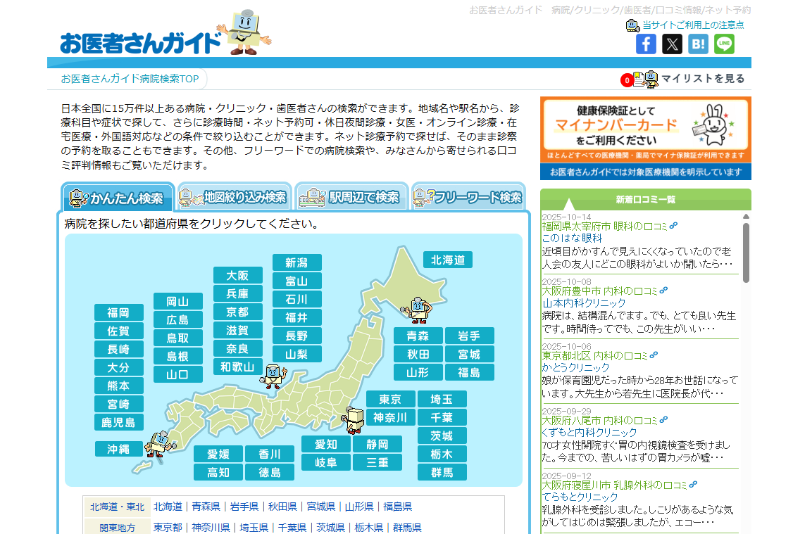 お医者さんガイドは病院・診療所を地域ごとに検索できるシンプルなUI。