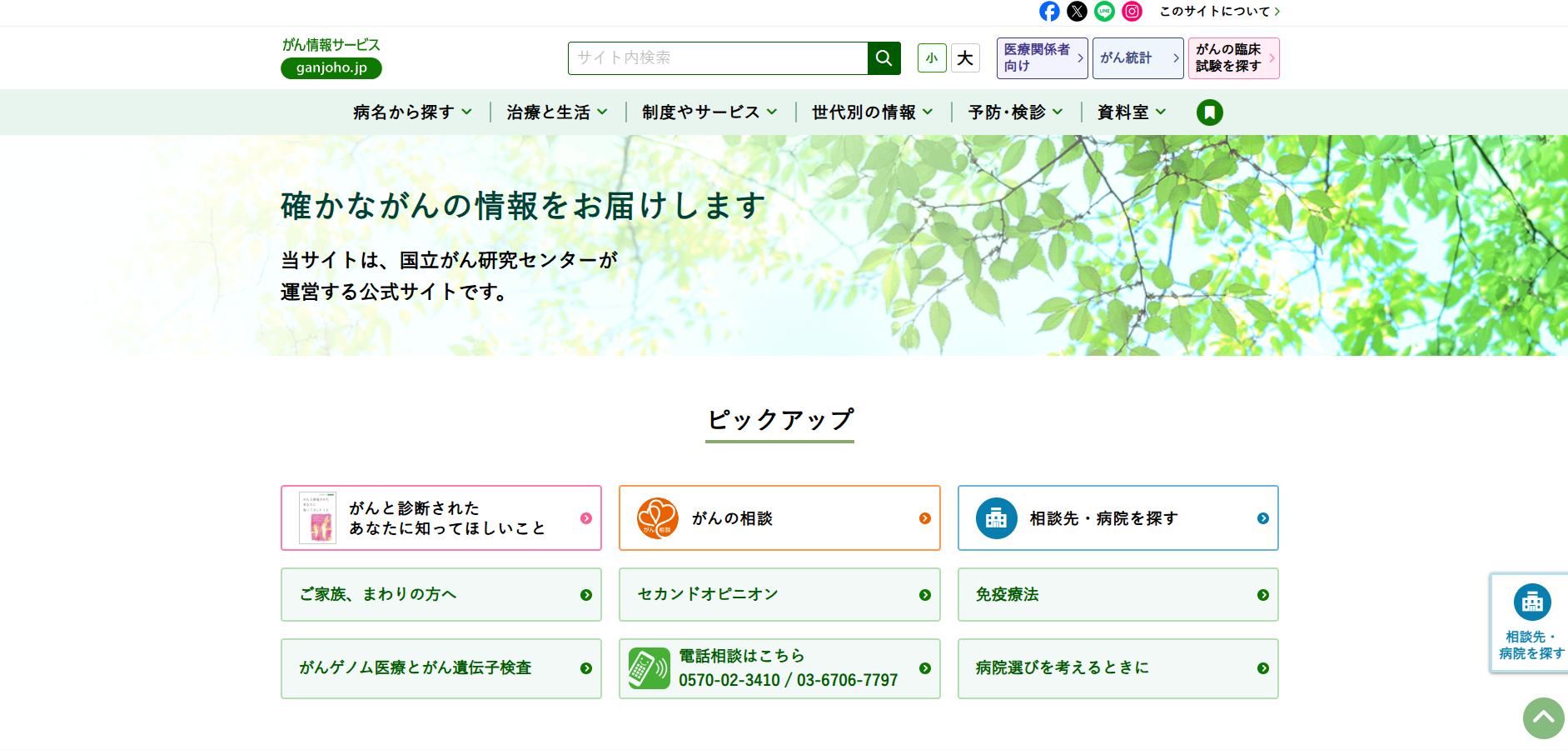 国立がん研究センターがん情報サービスは難しい医療情報を一般ユーザー向けにかみ砕き、病気別に体系的に整理。