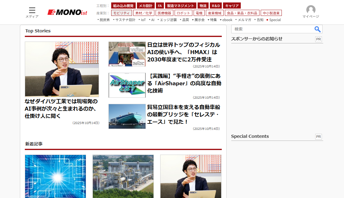MONOistは業界ニュースや技術解説を集約。落ち着いた配色で専門性を表現し、ビジネスユーザーに「信頼性」を伝えるデザインです。