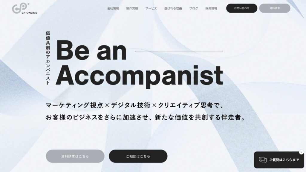 ジーピーオンラインは「価値共創のアカンパニスト(伴走者)」を掲げ、マーケティング・テクノロジー・クリエイティブという3つの視点で最適なソリューションを提供する姿勢を明確にしています。要件整理から設計、デザイン、開発、運用までの一気通貫体制を前提に、企業の目的達成に向けて“作って終わり”にならない支援を行う点が特長です。