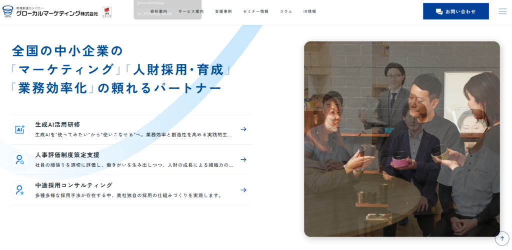 株式会社グローカルマーケティングの主な事業はマーケティング戦略の策定支援や人材採用・育成支援、業務効率化などで、地域の企業が抱える経営課題の解決を総合的にサポートしています。