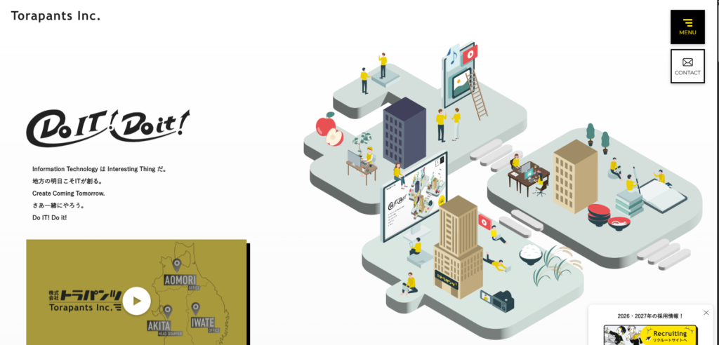 | 事業内容 | ホームページの企画・デザイン・制作 ホームページの運営管理サポート・メンテナンス CMSなどオリジナルシステム設計・開発 SEO&SEM検索エンジン対応 Web広告運用・SNS広告運用 DM・パンフレット・DTPデザイン ロゴ・イラスト制作 サーバーレンタル ドメイン取得 ネットワーク・システム管理 スマートフォン・タブレットアプリ開発(Android・iOS) CM・ムービー等各種映像制作 3DCG制作 空撮・特機使用撮影 販促イベント企画運営 トラパンツコンテンツスクール運営 ホテルアルファイン秋田 経営 飲食店「虎穴」経営 テナントオフィス・駐車場賃貸 |