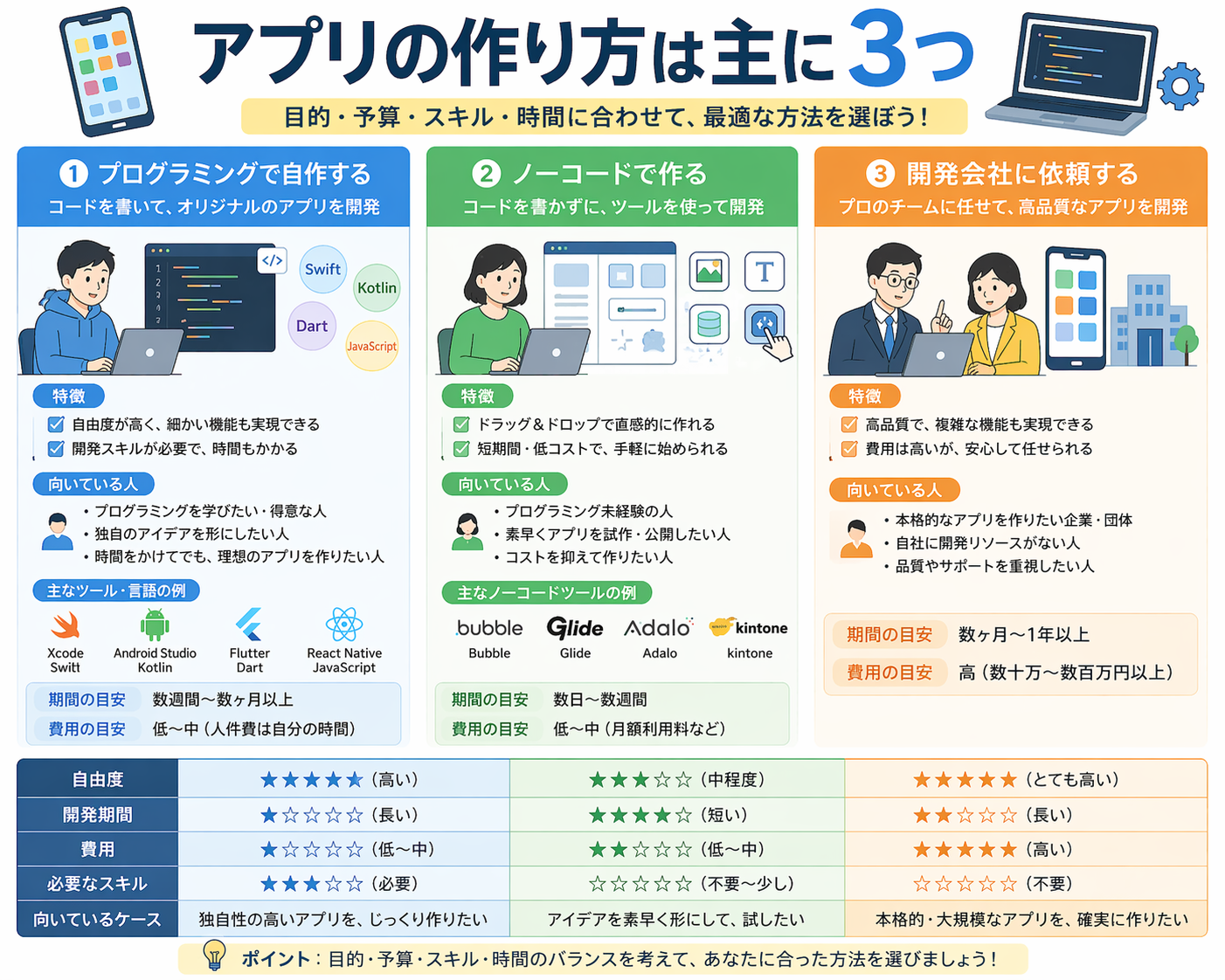アプリの作り方には、自作、ノーコード、外注という、大きく分けて3つの方法があります。