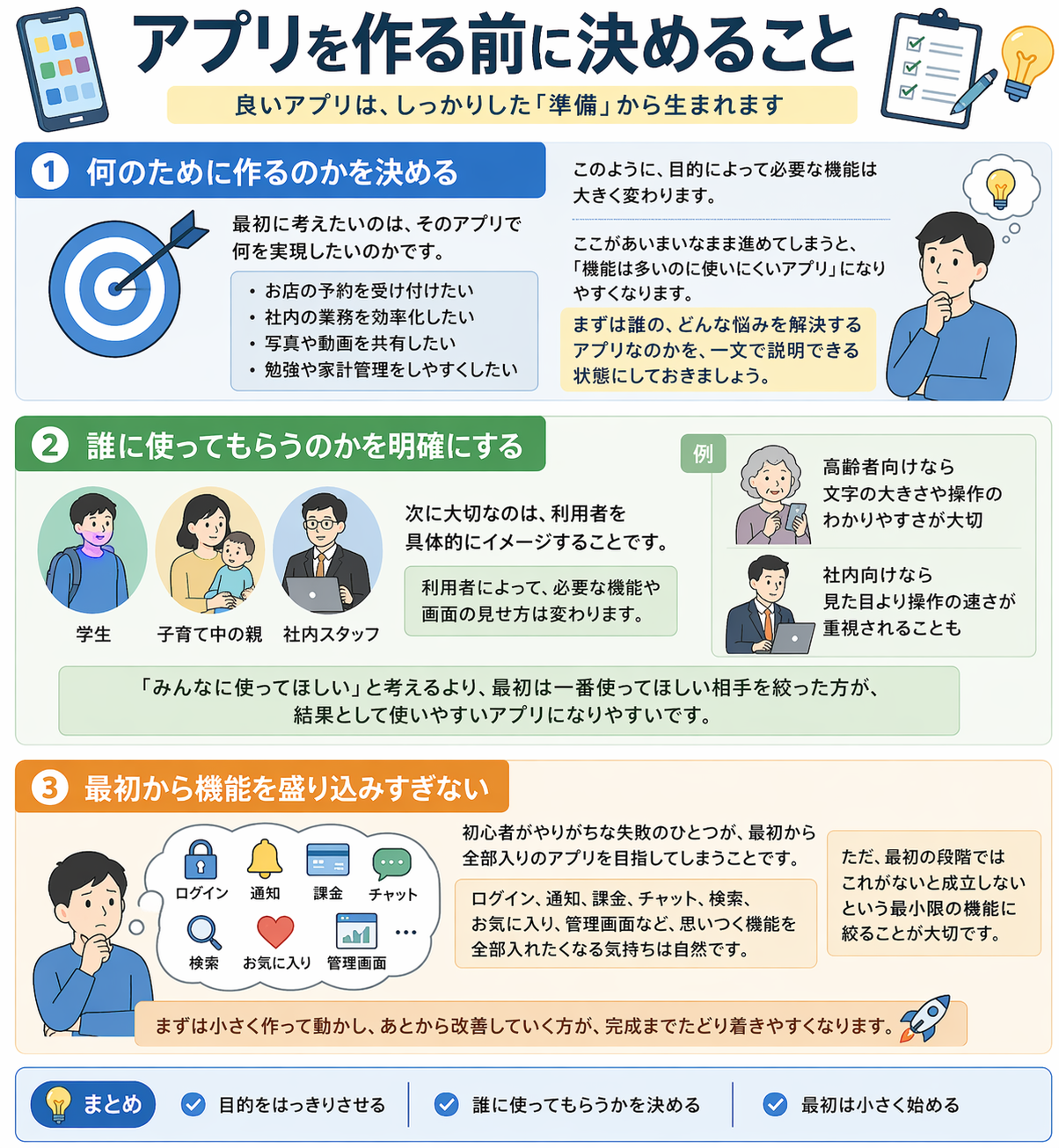 「誰のために」「何を解決するために」「どの方法で作るのか」を先に整理しておくことで、失敗しにくくなります。