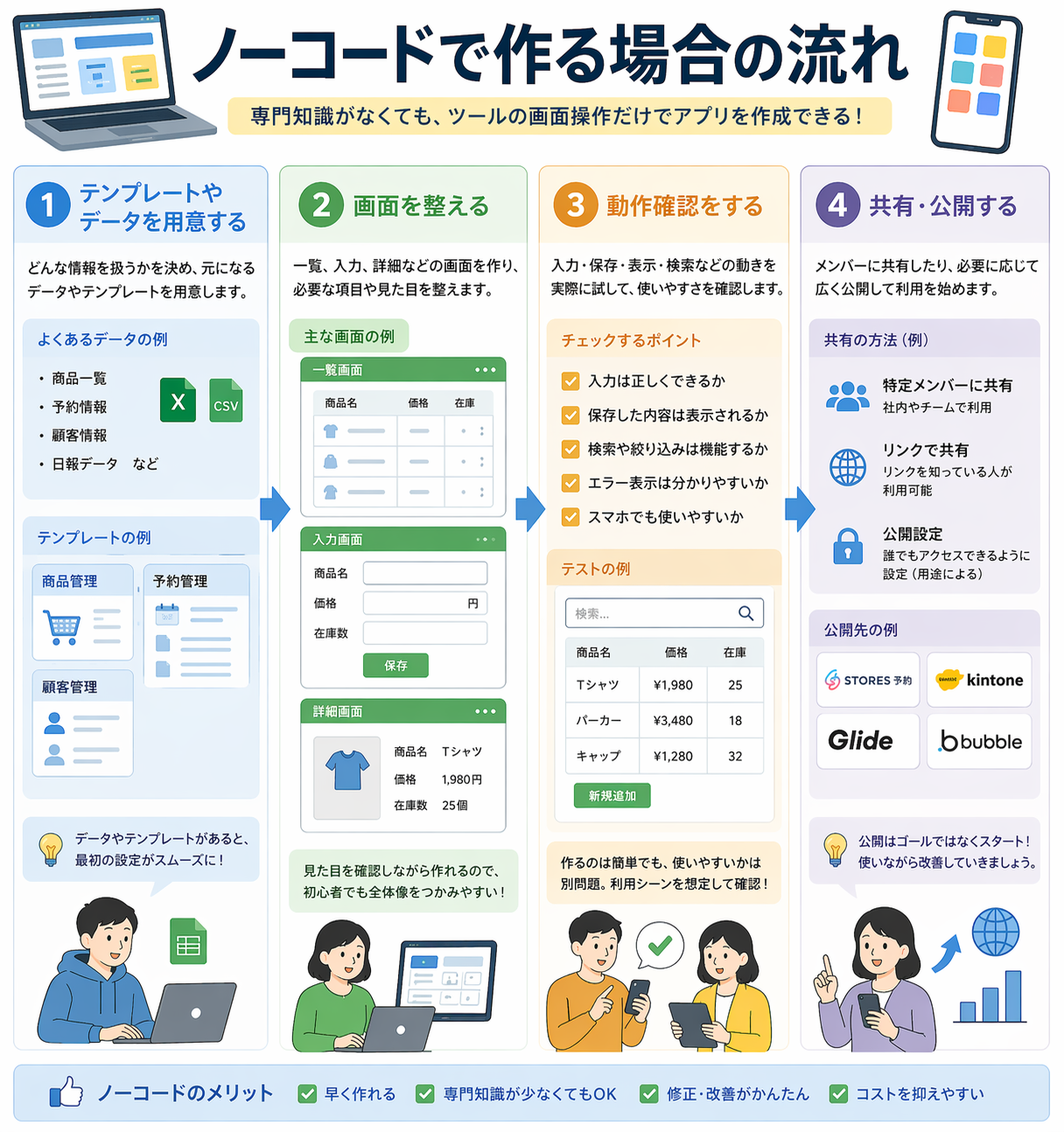 ノーコードは見た目を確認しながら進めやすいため、初心者でも全体像をつかみやすいのが魅力です。