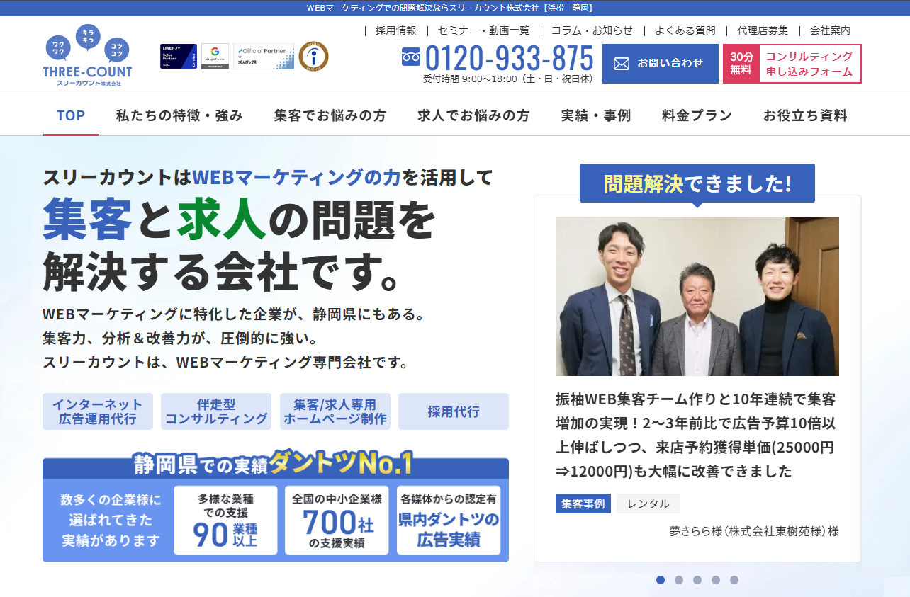 スリーカウント株式会社は、地域密着型ながら全国規模で成果をあげているWebマーケティング会社です。特に「集客」と「求人」に強く、Webサイト制作やSEO、広告運用を通じて、中小企業の経営課題を具体的に解決しています。