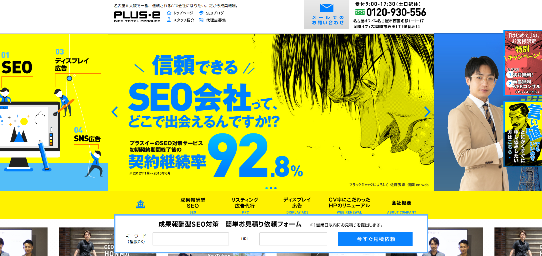 株式会社プラスイーは、SEO対策を中心としたWEB集客支援を行うコンサルティング会社で、最大の特徴は、「完全成果報酬型」のSEO対策です。検索エンジンで上位表示が実際に達成された日数分のみ料金が発生する仕組みで、成果が出なければ一切費用が発生しません。初めてSEOを依頼する方にとっては「成果が出るまでどのくらいかかるのか」「無駄なお金を払わないか」という不安がつきものですが、プラスイーの報酬体系はその不安を払拭してくれます。