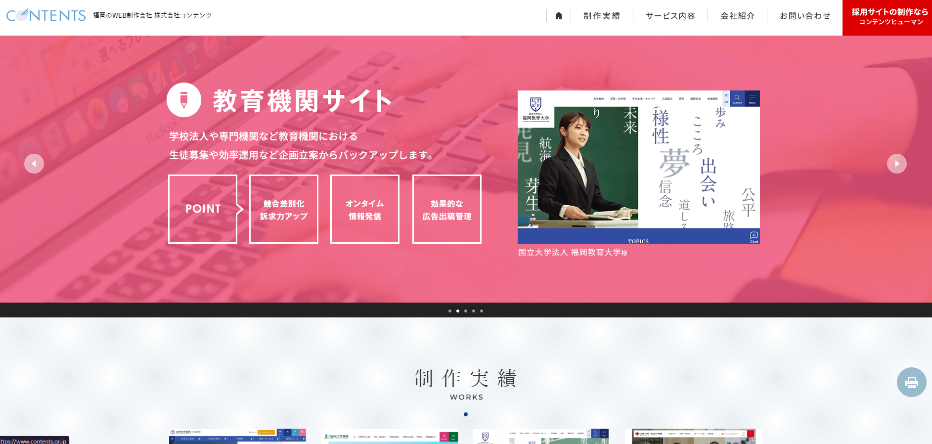 株式会社コンテンツは、企業や病院、教育機関などを中心に1,000件を超えるホームページ制作実績を持つ老舗のWeb制作会社です。「Webのことは全部まかせられる」安心感を持ち、初心者にも非常に頼りになる1社です。