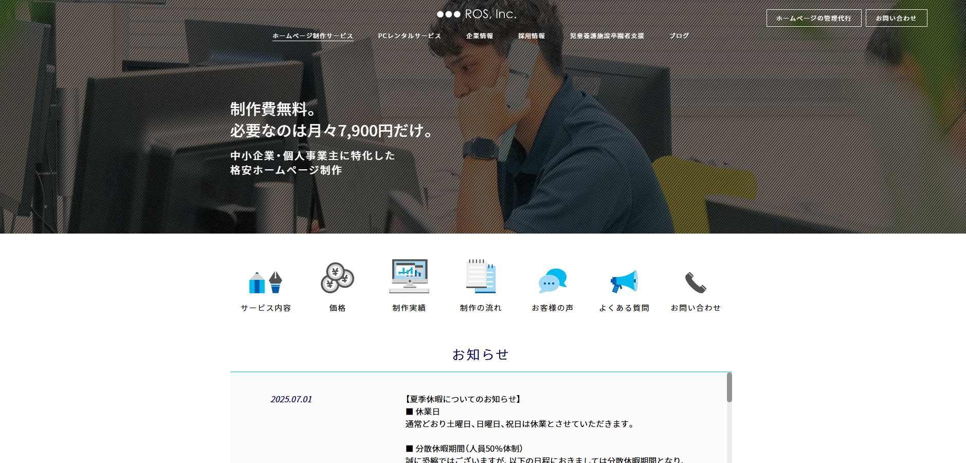 ROS株式会社の最大の特長は、ホームページ制作に関するすべての工程が初期費用無料・月額7,900円(税抜)という明朗な定額制に含まれていることです。具体的には、現地での取材やプロによる写真撮影、原稿の作成、デザイン、SSL対応(通信暗号化)までワンストップで対応。しかも、サーバー費やドメイン取得料もすべて込みです。