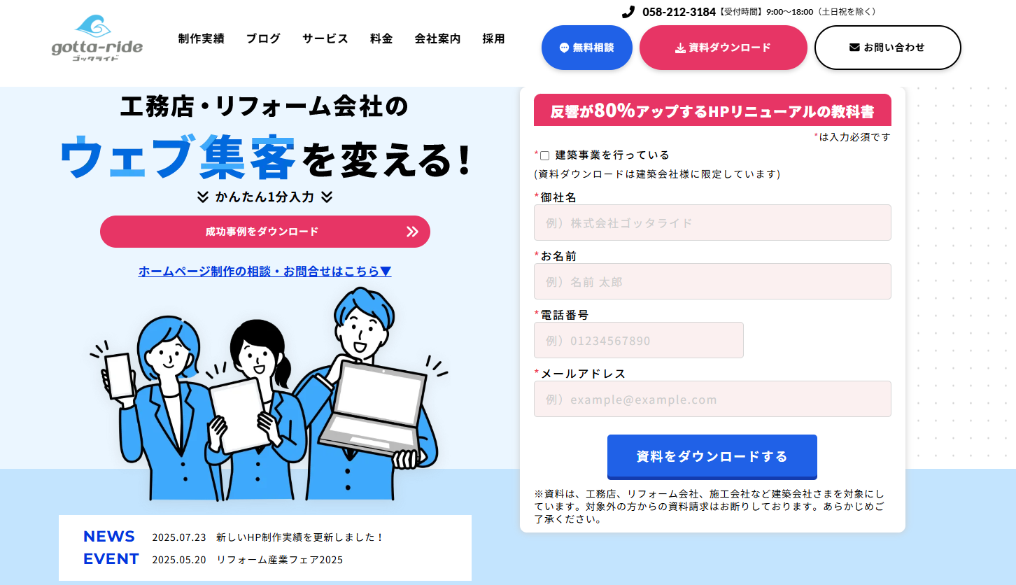 株式会社ゴッタライドは、全国の工務店・リフォーム・塗装会社向けに特化したホームページ制作・集客支援を展開する企業です。「建築業界専門のWeb会社」として、業種別の傾向やユーザー心理を踏まえた提案力に定評があります。